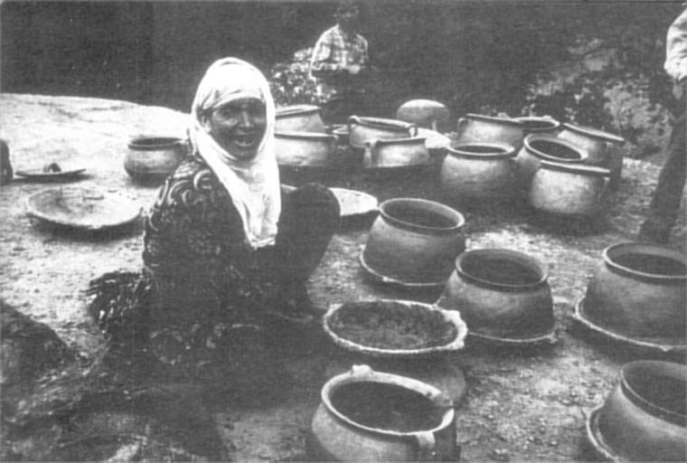 29 Önce geza adı verilen güveçlerin dip kısımları bizyeniğin çukurluğundan yararlanarak yapılmaktadır. Tezgâh görüldüğü gibi, ters döndürülmüş bizyeneğin üzerine oturtulmuş ikinci bir bizyenekten oluşmaktadır. Henüz milin bulunmamasına karşın dönme işlemi artık biraz olsun kolaylaşmıştır. |