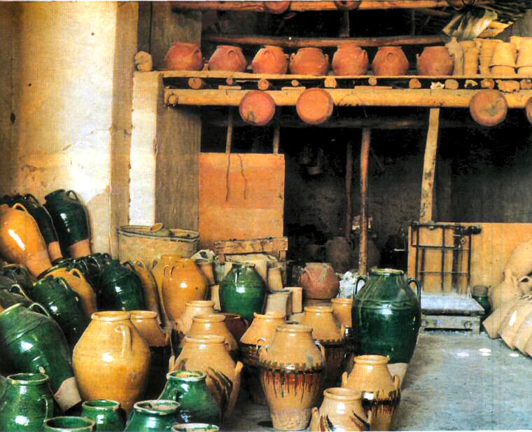 189 Malatya'da çömlekçi atölyelerinden birinin kentteki küpçü dükkânı. Arka üst planda Uslu köyü güveçleri görülüyor. Uslulular bazan kendi ihtiyaçları için güveçlerini bu atölyede sırlatmaya getirmektedirler.